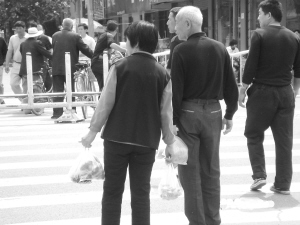 5月19日上午10∶30,市區(qū)八一路與育新街交叉口,兩位老人購物結(jié)束,手拎塑料袋,正在等候通過馬路。