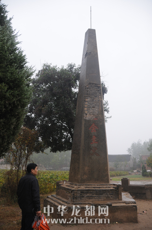 ????在秋雨中,我們走進(jìn)陵頭崗村北頭的普理小學(xué),這是所普及革命真理的紅色校園。在青松和古柏的映襯下,校園操場(chǎng)中央矗立的三崗革命根據(jù)地紀(jì)念塔顯得更加莊嚴(yán)肅穆,塔身正面刻寫(xiě)著“為了革命事業(yè)的勝利,英勇?tīng)奚挠⑿蹅兦Ч挪恍唷?1個(gè)大字,塔身背面的字跡雖然已經(jīng)模糊,但仔細(xì)辨認(rèn)還能看到這樣一段話:“河南省老根據(jù)地建設(shè)委員會(huì)為了培養(yǎng)老區(qū)人民的后一代,使其繼承革命事業(yè)的優(yōu)良傳統(tǒng),成為社會(huì)主義的建設(shè)者和保衛(wèi)者,乃于一九五六年撥發(fā)款項(xiàng)修葺擴(kuò)建三崗小學(xué),欣值落成用特志其端末,以資留念,時(shí)在一九五七年十月?!边z憾的是,由于年久失修,塔身西北側(cè)上半部已經(jīng)風(fēng)化,刻寫(xiě)的“一切為了社會(huì)主義”8個(gè)大字只剩下“一”“會(huì)主義”4個(gè)字,覆蓋在塔身中部外層的水泥已經(jīng)脫落,露著磚塊。據(jù)69歲的村民侯民生介紹,1957年10月,普理小學(xué)從陵頭崗村舊址搬遷到此后進(jìn)行了擴(kuò)建,不僅蓋起了當(dāng)時(shí)全縣一流的校舍,還在校園正中心建起了這座紀(jì)念塔。