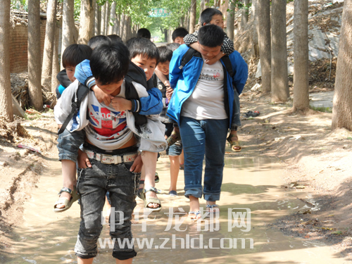上學(xué)路上有段泥路,每逢下雨時,大孩子幫助小孩子趟水走過????