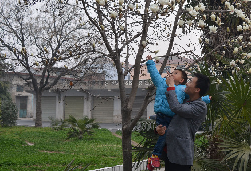 ????春風(fēng)送暖,各種花次第開放,引得市民爭相品味醉人的春色。圖為昨日扶溝縣一對父子在觀賞盛開的木蘭花。扶溝縣大力開展生態(tài)林業(yè)建設(shè),營造良好的人居環(huán)境。春天一到,鮮花斗艷,春草吐綠,處處春色醉人。(記者 王泉林 攝)