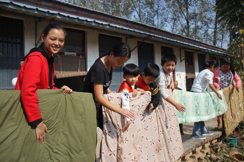 ????上圖:在九九重陽節(jié)來臨之際,為弘揚中華民族傳統(tǒng)美德,營造尊老、敬老、愛老、助老的良好風尚,項城市開展了“溫暖重陽·關愛老人”重陽節(jié)慰問活動,為敬老院的老人送去了慰問物品,讓老人們感受到社會的關愛和溫暖。圖為該市中小學生在南頓鎮(zhèn)敬老院為老人們晾曬被褥。 張永久 攝
