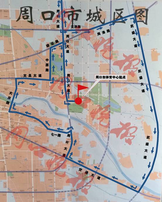 ????賽事初步確定報(bào)名參賽總?cè)藬?shù)為1萬(wàn)人,其中,全程馬拉松2000人,半程馬拉松2000人,迷你馬拉松6000人。比賽路線(如圖)暫定為:市體育中心(起點(diǎn))——周口大道——北高速口轉(zhuǎn)折——太清路——周淮路——武盛大道——周項(xiàng)路——周口大道——七一路——大慶路——文昌大道——中原路——建設(shè)路——周口大道——市體育中心(終點(diǎn))。
