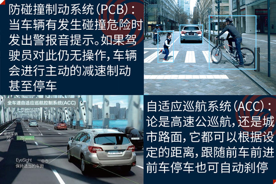 EyeSight駕駛輔助系統(tǒng)是避免事故發(fā)生,此次在中國(guó)市場(chǎng)亮相是它的第三代產(chǎn)品,其主要亮點(diǎn)是通過(guò)兩個(gè)模擬人眼的立體攝像頭,來(lái)監(jiān)控距離車輛前方100米以內(nèi),高度在1米以上的人、車輛和物體,以減少傷害為目的的駕駛輔助系統(tǒng);除了距離以外,還可以對(duì)方向、高度大小等指標(biāo)進(jìn)行識(shí)別。它的主要功能分為四大類,分別是防碰撞制動(dòng)系統(tǒng)(PCB)、車速自適應(yīng)巡航控制系統(tǒng)(ACC)、起步油門誤操作預(yù)防系統(tǒng)和警報(bào)與提示系統(tǒng)。