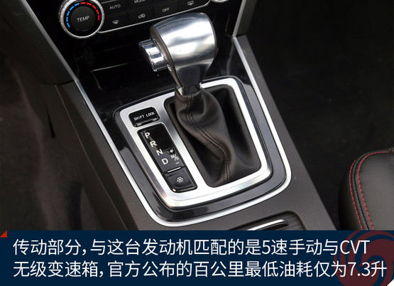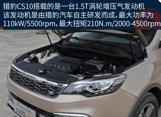 本次我們?cè)囻{的獵豹CS10搭載了一臺(tái)1.5T渦輪增壓氣發(fā)動(dòng)機(jī),最大功率為110kW/5500rpm,最大扭矩為210N.m/2000-4500rpm。傳動(dòng)部分,與這臺(tái)發(fā)動(dòng)機(jī)匹配的是5速手動(dòng)與CVT無級(jí)變速箱,并采用前置前驅(qū)的驅(qū)動(dòng)形式。