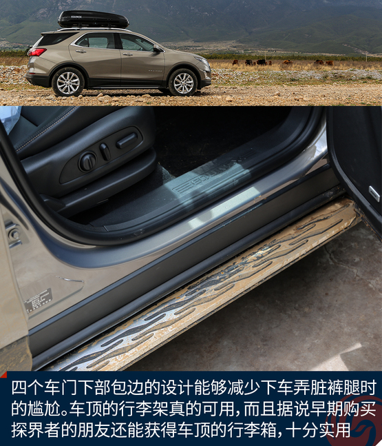 外觀上令我印象深刻的地方有這么幾個(gè),首先前后燈組都運(yùn)用了大量的LED光源,不過(guò)稍顯遺憾的是,沒(méi)有全部都采用LED,我猜在探界者中期改款的時(shí)候會(huì)有所改變。四個(gè)車門(mén)下部包邊的設(shè)計(jì)能夠減少下車弄臟褲腿時(shí)的尷尬。車頂?shù)男欣罴苷娴目捎?,而且?jù)說(shuō)早期購(gòu)買探界者的朋友還能獲得車頂?shù)男欣钕洌謱?shí)用。雙出的排氣看上去很有氣勢(shì),而探界者身上的這個(gè)鯊魚(yú)鰭天線應(yīng)該是我見(jiàn)過(guò)最粗壯的了。車輪的造型十分動(dòng)感,而且尺寸也是兼顧了SUV應(yīng)有的實(shí)用性。