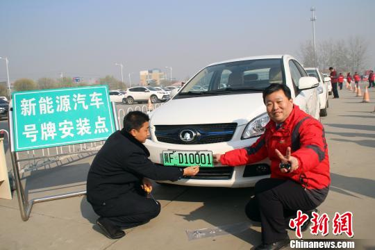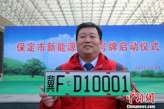 ????保定市民康辰龍領到該市第一副新能源汽車專用號牌?!∮诳×痢z