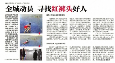 1月3日,中央電視臺新聞頻道《新聞直播間》欄目報(bào)道此事。一時(shí)間,“紅褲頭”救人的事跡,在金昌市乃至整個甘肅省引起了強(qiáng)烈的反響。在官方微信平臺上,有上百條留言,大多是為“紅褲頭”小哥點(diǎn)贊的。不少人希望找到這個不愿留名的英雄。為此,《金昌日報(bào)》以及當(dāng)?shù)孛襟w紛紛發(fā)起“尋找紅褲頭好人”“尋找冰窟救人的無名英雄”的尋人啟事。
