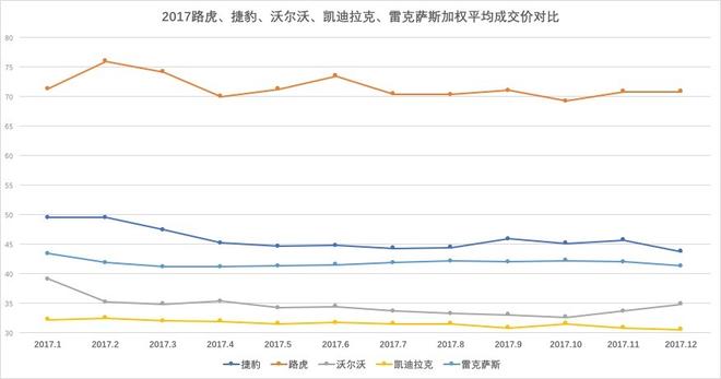 凱迪拉克、捷豹路虎、雷克薩斯、沃爾沃四個(gè)品牌銷量在10萬輛以上為第二陣營(yíng)。除路虎外,捷豹因進(jìn)口F-pace帶動(dòng)其成交價(jià)上揚(yáng),隨著XE國(guó)產(chǎn)上市銷售,捷豹銷量有望進(jìn)一步增長(zhǎng),價(jià)格進(jìn)一步下探;以銷售進(jìn)口車型為主的雷克薩斯,今年銷量質(zhì)量不錯(cuò),庫(kù)存時(shí)間短,資金周轉(zhuǎn)快,多數(shù)以訂單方式銷售,加權(quán)平均價(jià)在42萬上下,成交價(jià)格走勢(shì)平穩(wěn),經(jīng)銷商今年利潤(rùn)也很豐厚。沃爾沃在新款車型的帶動(dòng)下,成交價(jià)格開始上揚(yáng);凱迪拉克今年銷量增速較快,通過下圖我們可以看到,凱迪拉克基本依靠低價(jià)獲取銷量的增長(zhǎng),成交價(jià)格進(jìn)一步走低,經(jīng)銷商的利潤(rùn)需要依靠廠家補(bǔ)貼。