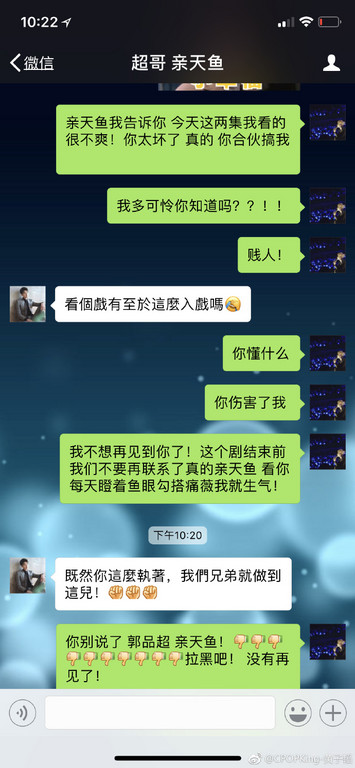 這讓郭品超也非常無奈,響應:“看個戲,有至于這么入戲嗎?”隨后黃子韜似乎還無法消氣,激動表示:“我不想再見到你了!這個劇結(jié)束前,我們不要再聯(lián)系了,真的親天魚(秦天宇),看你每天瞪著眼、勾搭痛薇(童薇,楊冪劇中角色)我就生氣!”郭品超也只好同意:“既然你這么執(zhí)著,我們兄弟就做到這兒!”兩人一來一往逗趣對話,逗樂不少粉絲,調(diào)侃:“別的演員發(fā)微博是宣傳,他是真的在追劇”、“追得比粉絲還激動”、“這是用生命在追劇”,意外引起一陣熱議。