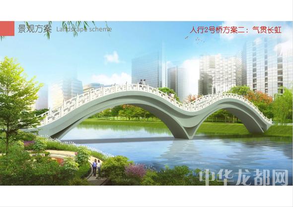 人行2號(hào)橋的設(shè)計(jì)方案有兩套,分別為“旭日東升”和“氣貫長(zhǎng)虹”。“旭日東升”為圓形塔懸索橋。記者從效果圖中看到,該橋的橋塔為圓形,猶如一輪東升的太陽(yáng),象征著城鄉(xiāng)一體化示范區(qū)蓬勃發(fā)展的未來?!皻庳為L(zhǎng)虹”為中承式系桿拱橋。該方案結(jié)合中國(guó)玉帶橋的古典元素、抽象古典幾何美學(xué),采用現(xiàn)代的設(shè)計(jì)手法,創(chuàng)作出現(xiàn)代感和中國(guó)傳統(tǒng)橋梁元素雜糅的橋梁設(shè)計(jì)。