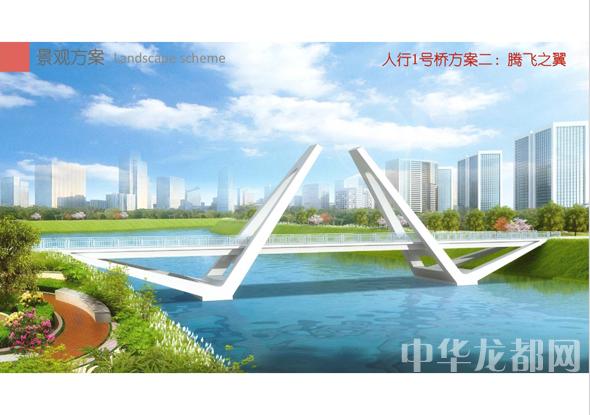 人行1號(hào)橋的設(shè)計(jì)方案有兩套,分別為“飛龍?jiān)谔臁焙汀膀v飛之翼”?!帮w龍?jiān)谔臁睘殡p塔斜拉橋。記者從效果圖中看到,該橋呈現(xiàn)出優(yōu)美的線條,宛如一條長(zhǎng)龍騰空在天。“騰飛之翼”為V腿連續(xù)鋼箱梁橋。記者從效果圖中看到,橋體簡(jiǎn)潔流暢,時(shí)尚現(xiàn)代,橋墩形成穩(wěn)固的三角形,像兩只燕子展翅高飛。