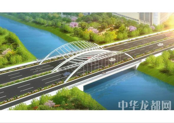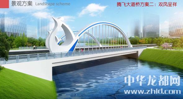 騰飛大道橋的設(shè)計(jì)方案有兩套,分別為“彩蝶飛舞”和“雙鳳呈祥”。“彩蝶飛舞”為下承式鋼管拱橋,寬36米。記者從效果圖中看到,橋兩側(cè)的拱圈,極具色彩感,給人一種賞心悅目的感覺?!半p鳳呈祥”為裝飾鋼管拱橋,寬36米。該橋采用“雙鳳”造型,象征天下太平,富含吉祥之意。