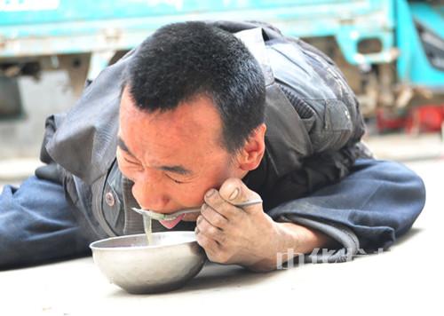 媽媽乘上一碗放在地上,紅印坐在墊子上,用腳夾著勺子,彎下腰來吃得很香。看到紅印吃飯那么費(fèi)力,在場(chǎng)人心里酸酸的,為紅印自強(qiáng)不息所打動(dòng)著??墒钱?dāng)初娘倆可沒少流眼淚,李新蘭發(fā)現(xiàn)兒子兩只腳是靈活完好的,就開始訓(xùn)練他用腳吃飯、洗臉。養(yǎng)大一個(gè)正常的孩子尚且不易,何況是張紅印這樣的孩子?李新蘭一遍遍地教,年幼的張紅印一遍遍地學(xué)。難為到受不了時(shí),娘倆就抱在一起哭。
