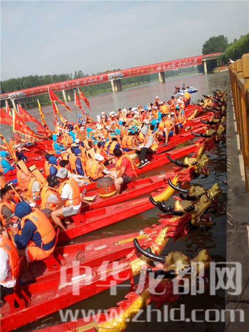 比賽開始前,位于周口大道橋東側(cè)的中華龍舟大賽賽場已是喧聲鑼鼓,人海如潮,不少市民攜家?guī)Э谇皝碛^戰(zhàn)。河中,二十多條龍舟整齊地排列在水面上。