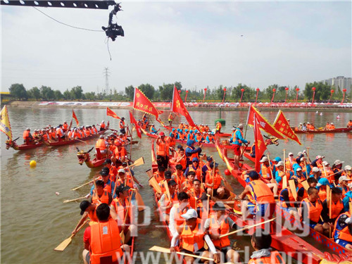 精彩無比的翎船捕鴨賽后,首先進行的是市直組、企業(yè)組200米競速賽的預(yù)選賽。隨著發(fā)令槍響,各參賽隊伍迅速搖動船槳,爭先恐后地向前劃行。在兩岸觀眾一浪高過一浪的吶喊助威聲中,參賽隊頑強拼搏,競相沙潁河上飛渡,不僅點燃了市民傳承龍舟文化的熱情,也點燃了周口人民的競進激情。