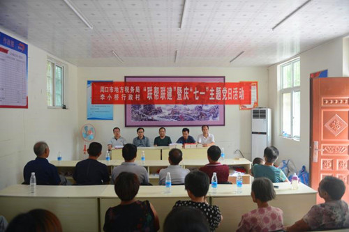 中華龍都網(wǎng)訊(周口報(bào)業(yè)全媒體記者 馬治衛(wèi) 通訊員 蘇童)為喜慶中國(guó)共產(chǎn)黨建黨97周年,夯實(shí)貧困村基層組織基礎(chǔ),促進(jìn)脫貧攻堅(jiān)工作深入開(kāi)展,按照中共周口市委組織部和周口市直工委要求,6月26日上午,周口市地稅局組織相關(guān)科室負(fù)責(zé)人走進(jìn)幫扶村太康縣王集鄉(xiāng)李小村行政村開(kāi)展“黨建聯(lián)幫聯(lián)建暨慶七一主題黨日”活動(dòng)。這是該局在幫扶村“兩委”成功換屆之后第一次舉辦主題黨日活動(dòng),市、縣、鄉(xiāng)各級(jí)領(lǐng)導(dǎo)及駐村工作隊(duì)和幫扶村30余名黨員代表參加了此次活動(dòng)。