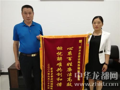 中華龍都網(wǎng)訊(周口報(bào)業(yè)全媒體記者 付永奇 通訊員魏紅 位慶華 )6月26日上午,商水縣信訪局門前鼓樂喧天、鞭炮齊鳴、人群涌動。其間,幾名群眾簇?fù)碇幻嫔蠒靶南蛋傩樟疂嵏咝艖n解難共創(chuàng)和諧”的錦旗徑自向商水縣信訪局走來。