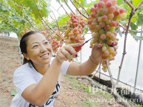 7月4日,商水縣鄧城鎮(zhèn)返鄉(xiāng)農(nóng)民工馮杰在采摘葡萄。馮杰和丈夫葉天力在鎮(zhèn)人大和扶貧辦的幫助下,投資300多萬元創(chuàng)建110畝天力葡萄采摘園,取得了較好的收益。 喬連軍 攝