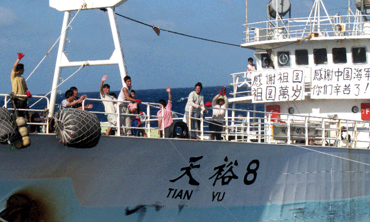 看到??谂?,“天裕8號”船員就像見到了久違的親人,紛紛走上甲板,歡呼著向海口艦揮手致意,并在船上升起一面鮮艷的五星紅旗。他們年齡大約在二十歲左右,在甲板上行走如飛,如履平地一般。