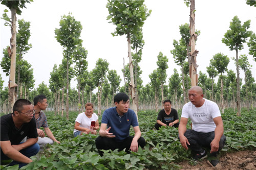 與前廟相鄰的大張村,是一個“天然大氧吧”。從大張村走出來的曹紅星在鄭州從事園林綠化多年,在朱口鎮(zhèn)黨委、鎮(zhèn)政府的支持和鼓勵下,他以1000元/畝的價格流轉(zhuǎn)了1000多畝土地,種植法桐、欒樹、國槐等綠化樹。有著豐富經(jīng)驗的曹紅星在種植綠化樹的同時,積極發(fā)展林下經(jīng)濟,在綠化樹下種植紅薯、大蒜等,有效提高了土地的利用率,經(jīng)濟效益顯著提高?!捌綍r,綠化林地除草、抗旱、施肥需要用工,收種紅薯、大蒜等也需要用工,用工時貧困戶優(yōu)先。只要有勞動能力,來這里就能掙錢。”曹紅星說,林業(yè)經(jīng)濟的快速發(fā)展為鄉(xiāng)親們脫貧致富提供了保障。