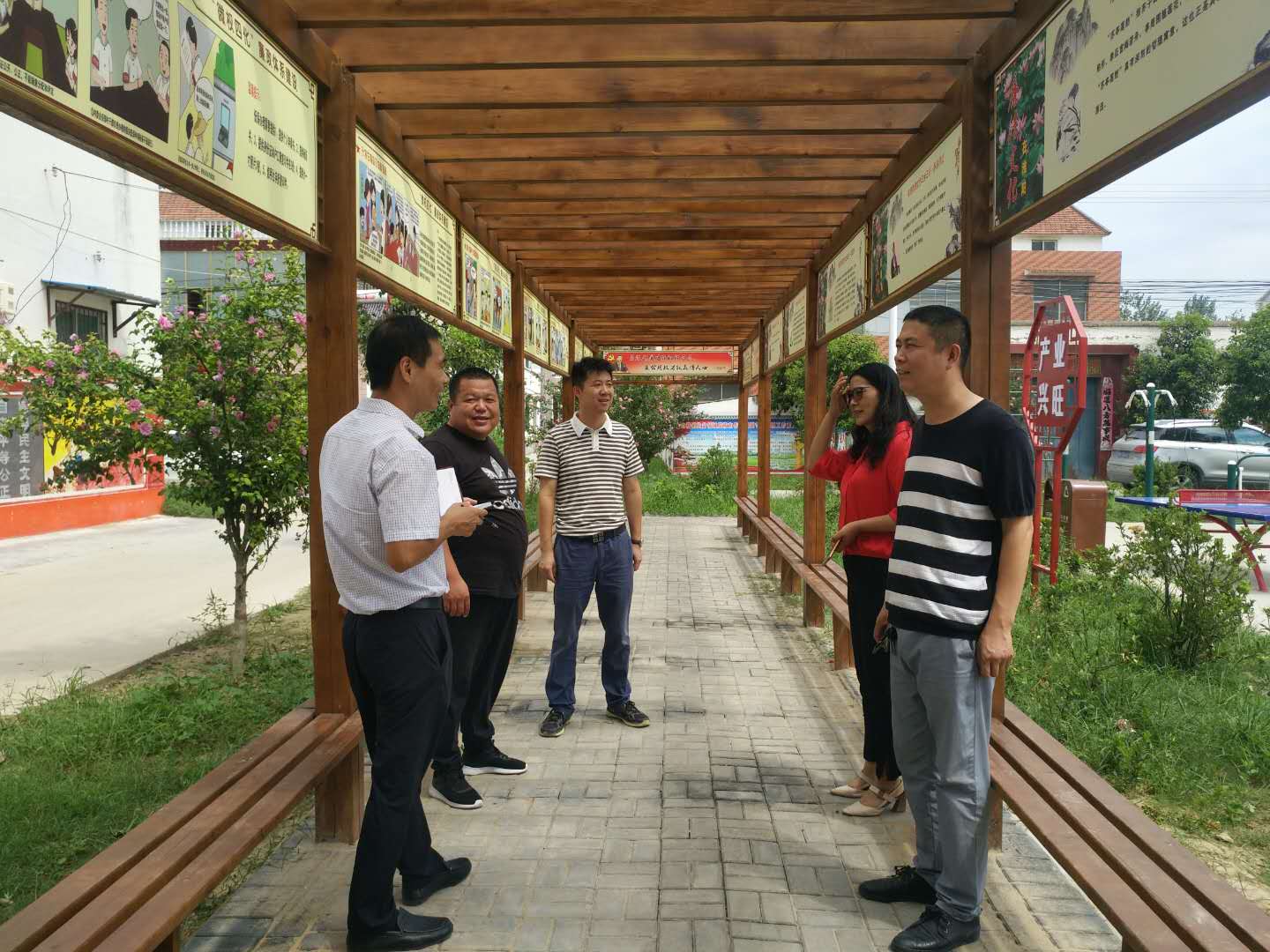 一條干凈的水泥路從村子中間橫穿而過,路兩側(cè)和村民房前屋后的大葉女貞流綠滴翠,木槿花開正盛,花朵壓彎了枝條,一面面文明禮讓、孝親敬老、鄰里和睦、移風易俗、反腐倡廉的文化墻,畫面生動、形象,讓人忍不著駐足觀看,社會主義核心價值觀宣傳處處可見。