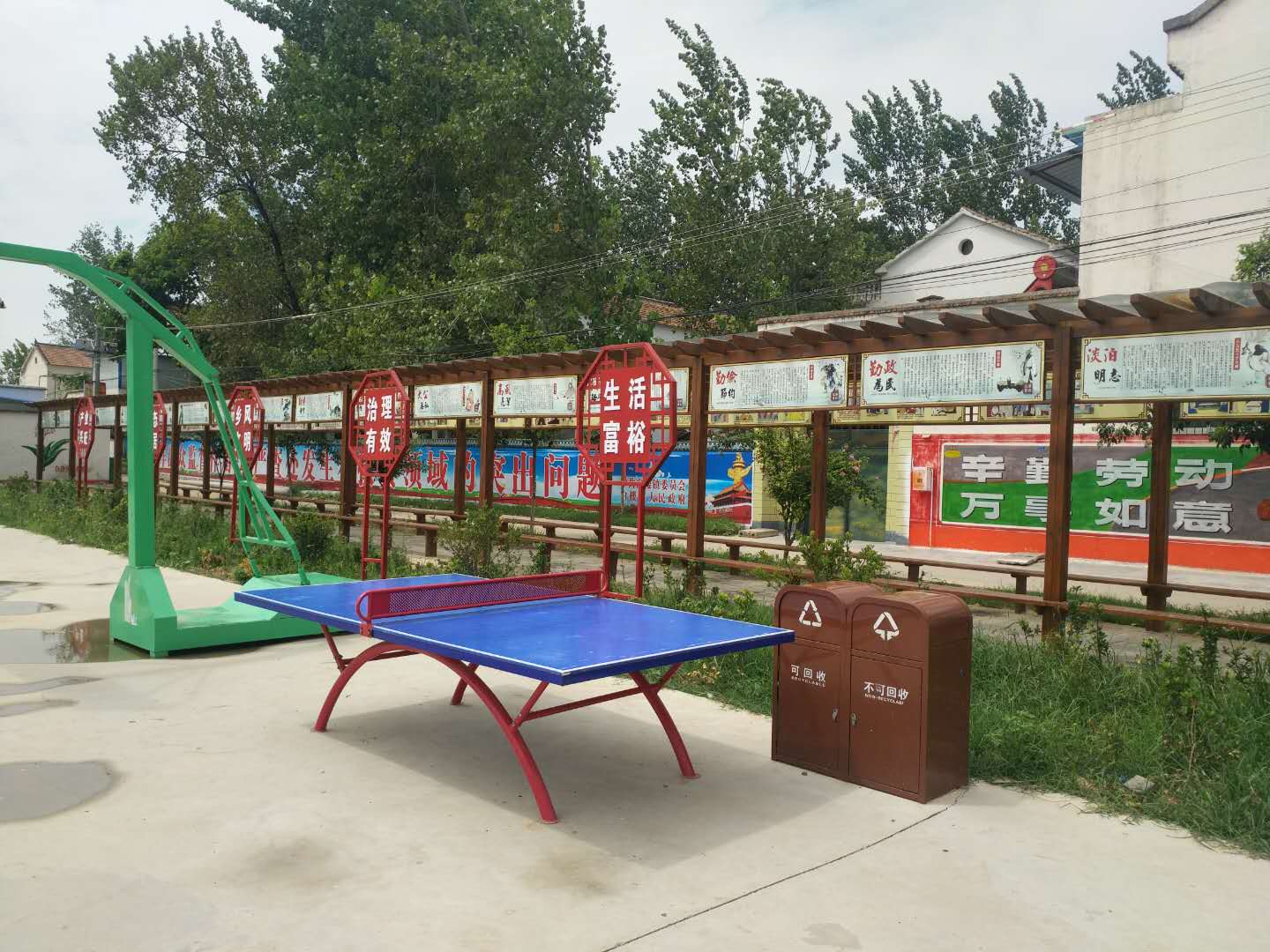 在近2000平方米的文化廣場上,南側(cè)聳立著高高的旗桿,上方五星紅旗迎風飄揚;北側(cè)一字排開牽引器、漫步機、 健騎機、扭腰器等健身器材,五六位鶴發(fā)童顏的老年人正樂呵呵地鍛煉;東側(cè)設立的籃球架、乒乓球臺正等待放學的孩子前來玩耍;西側(cè)新設的木排廊成了村民休閑聊天的好去處。村黨支部書記郝道杰稱,前一段,有村民提出,健身后累了缺少休息的地方。在征求群眾意見的基礎上,他們設置了這個木質(zhì)排廊。