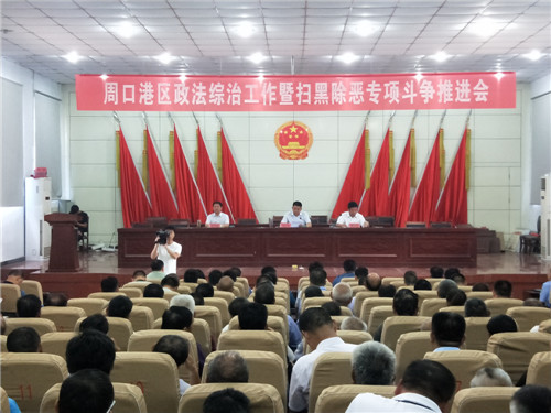 9月6日,周口港區(qū)召開政法綜治工作暨掃黑除惡專項斗爭推進會議。港區(qū)黨委書記孫紅偉出席會議并講話,紀(jì)委書記尚紅偉主持會議。港區(qū)公安分局政委何學(xué)民對掃黑除惡工作做具體部署。港區(qū)直屬各單位、市直派駐機構(gòu)負(fù)責(zé)人,公安、城管、消防、李埠口鄉(xiāng)全體黨員干部,各行政村主要負(fù)責(zé)人和村治保主任等近300人參加會議。