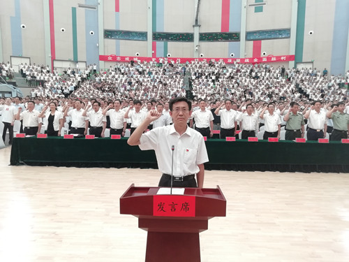 “不忘初心、牢記使命………爭分奪秒、苦干實干,堅決打贏脫貧攻堅戰(zhàn)!”隨著縣委書記馬明超領(lǐng)誓,與會的約4000名干部集體莊嚴宣誓??h委副書記、縣長王毅主持大會。