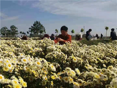當(dāng)日,位于高集鄉(xiāng)北部的黨橋、雙堂等幾個(gè)行政村,也是熱鬧非凡。一臺(tái)臺(tái)大小不同的車輛,滿載著剛從地里摘下的鮮菊花,正往富甲一方菊花加工廠里銷售,縷縷的菊花清香隨風(fēng)飄來,煞是誘人。在富甲一方合作社帶動(dòng)下,今年有16戶貧困戶種植80多畝菊花,鄉(xiāng)政府對首次種植的貧困戶負(fù)責(zé)技術(shù)培訓(xùn),并給予每畝1000元的生產(chǎn)獎(jiǎng)補(bǔ)。今年菊花每公斤4元左右,麥茬種植菊花每畝可產(chǎn)鮮菊1100-1300公斤,去掉雇人摘菊花費(fèi)用每公斤0.3元,每畝可收入4000-5000元。種植菊花的貧困戶孫建國在富甲一方收購現(xiàn)場,正樂呵呵的數(shù)著賣菊花得來的大把鈔票。