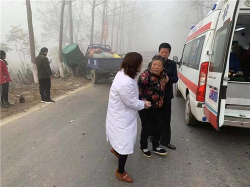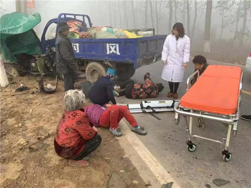 行至不遠(yuǎn)處,他們隱約發(fā)現(xiàn)前方有障礙物,并聽到有人呼救。王和平和同事立即下車走進(jìn)一看,只見一輛農(nóng)用三輪車和一輛電動(dòng)三輪車相撞,電動(dòng)三輪車被撞到路邊一顆樹上,整個(gè)車身被撞傾斜,事故現(xiàn)場(chǎng)有 4人東倒西歪地躺在地上,傷情不明。