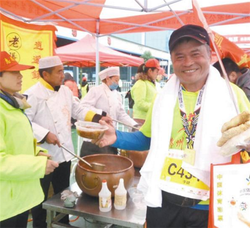 提起周口,“周口胡辣湯”可謂聲名在外。此次馬拉松賽事,主辦方為了讓選手品嘗到周口香辣可口的胡辣湯,特意將周口4家不同口味的胡辣湯“端”到比賽現(xiàn)場,讓很多跑友過了一把胡辣湯癮。圖為參賽選手品嘗胡辣湯。記者 張志新 攝