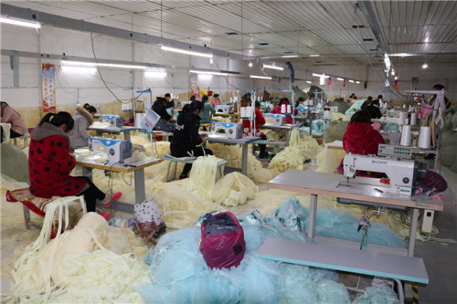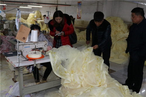 “對(duì)于有勞動(dòng)能力的貧困戶及留守婦女,只要報(bào)名一律錄用,根據(jù)個(gè)人能力提供合適崗位,免費(fèi)進(jìn)行業(yè)務(wù)技能培訓(xùn),變‘輸血’變‘造血’;成為熟練工的貧困戶,月收入均可達(dá)到3000元以上?!苯饎P盛家紡“扶貧車間”位于吳小廟村邊,該公司負(fù)責(zé)人趙開軍是楊湖口鎮(zhèn)走出去打工、在事業(yè)有成后返鄉(xiāng)創(chuàng)業(yè)的一個(gè)普通80后,他的公司總部位于江蘇省南通市,像這樣的幾百人加工基地附近有二三家,加工的產(chǎn)品一般是通過天貓、京東等知名電商平臺(tái)在全國(guó)進(jìn)行銷售,實(shí)行網(wǎng)上實(shí)行統(tǒng)一下單、就近發(fā)貨,這幾個(gè)基地主要負(fù)責(zé)長(zhǎng)江以北市場(chǎng)銷售,公司去年年銷售額已突破5000萬元,解決周邊村莊數(shù)千人在門口就業(yè),帶動(dòng)100多戶貧困戶脫貧。