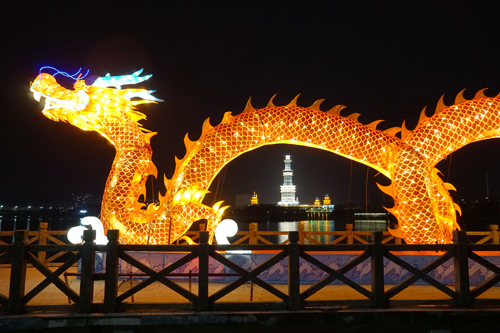 在周口公園,LED燈帶、燈網(wǎng)和霓虹燈交相輝映,遠(yuǎn)觀如如點(diǎn)點(diǎn)繁星。放眼望去,在人工湖上一條蜿蜒30米的“中華祥龍” 昂首盤踞在吊橋上,金黃奪目,栩栩如生。