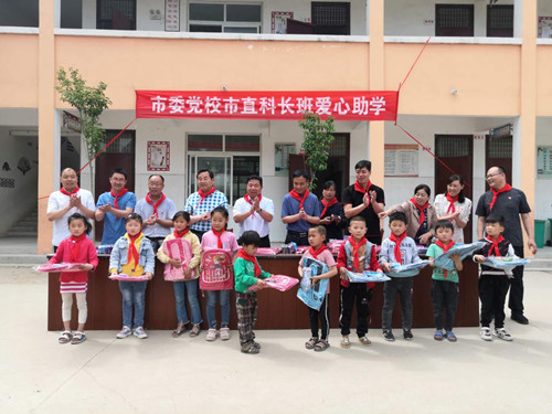 5月29日上午,2019年度市委黨校春季市直科長(zhǎng)班20多名學(xué)員代表,在該校副校長(zhǎng)高鵬帶領(lǐng)下,來(lái)到西華縣大王莊鄉(xiāng)東孫莊小學(xué)開(kāi)展愛(ài)心助學(xué)活動(dòng),為48名小學(xué)生送去圖書(shū)、書(shū)包、文具盒等“六一”禮包。