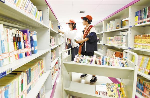 7月2日,在圖書館,參加“我當小圖書管理員”社會實踐活動的學生在整理圖書。