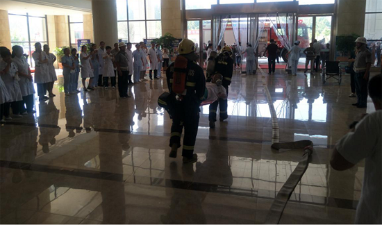 此次演練模擬一個蒙面歹徒在該縣六樓某科室打砸并故意縱火,轄區(qū)公安干警、消防指戰(zhàn)員及醫(yī)院保安力量迅速出動處置,防恐人員及時將犯罪分子制服,而此時醫(yī)院內(nèi)火災(zāi)迅速蔓延,多名醫(yī)護(hù)人員被困火場無法逃生,醫(yī)院負(fù)責(zé)人通過應(yīng)急廣播進(jìn)行人員疏散,消防指戰(zhàn)員按照預(yù)定應(yīng)急處置方案迅速展開滅火救援行動。