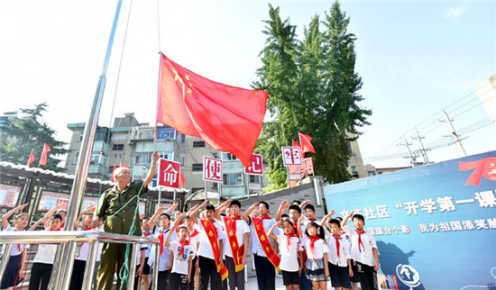 伴著雄壯的國(guó)歌聲,30多名孩子目不轉(zhuǎn)睛地看著國(guó)旗冉冉升起……為迎接新中國(guó)成立70周年,近日,江蘇省揚(yáng)州市邗江區(qū)雙橋街道文苑社區(qū)在社區(qū)國(guó)旗臺(tái)廣場(chǎng),組織開(kāi)展了開(kāi)學(xué)第一課“我與國(guó)旗合個(gè)影、我為祖國(guó)添笑臉”活動(dòng)。鮮艷的五星紅旗、燦爛的孩子笑臉,組成了一幅和諧美麗的畫(huà)面。