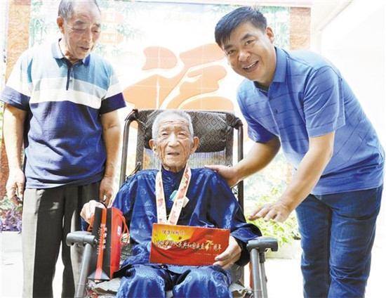 9月26日,商水縣退伍軍人事務(wù)局工作人員為譚莊鎮(zhèn)老革命段凌云送上新中國(guó)成立70周年紀(jì)念獎(jiǎng)?wù)?。今?8歲的段凌云15歲入伍,曾跟隨劉鄧大軍挺進(jìn)大別山,參加過淮海戰(zhàn)役、渡江戰(zhàn)役、解放大西南戰(zhàn)斗,多次榮立戰(zhàn)功。退伍后,他積極投身家鄉(xiāng)建設(shè),從沒有向組織上提過要求。
