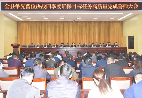 乘著周口市2019年第三季度項目觀摩的東風,扶溝吹響了決戰(zhàn)第四季度、奮力推動經(jīng)濟社會高質量發(fā)展的“沖鋒號”。10月21日,扶溝縣召開爭先晉位決戰(zhàn)四季度確保全縣目標任務高質量完成誓師大會,深入貫徹習近平總書記在河南考察調(diào)研指示精神,動員全縣上下進一步認清形勢,堅定信心,鼓足干勁,加大力度,大干苦干,決戰(zhàn)決勝,全力以赴做好第四季度工作,確保全年目標任務高質量完成。張穎波、詹凱、姜永來、張建中等縣四個班子領導出席會議??h委副書記、政法委書記詹凱主持會議。