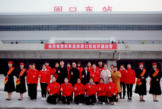 為慶祝鄭阜高鐵首發(fā),同時(shí)給乘客營(yíng)造一個(gè)溫馨舒適的乘車環(huán)境,提升城市溫度,12月1日,在團(tuán)市委的組織下,來(lái)自周口職業(yè)技術(shù)學(xué)院的80名青年志愿者聚集在周口東站,開(kāi)展志愿服務(wù)活動(dòng)。記者在現(xiàn)場(chǎng)看到,志愿者身穿統(tǒng)一服裝,分布在站前廣場(chǎng)、售票廳、進(jìn)站口、候車廳的各個(gè)角落,他們有的幫助乘客取票;有的引導(dǎo)乘客,幫助乘客進(jìn)站;有的則幫助車站工作人員分散客流量等。志愿者們積極熱情的工作態(tài)度,得到了廣大乘客的好評(píng)。