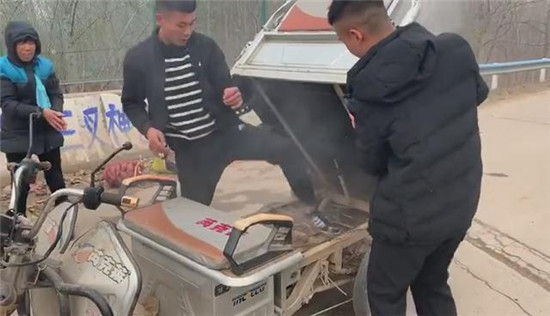淮陽:三輪車突然短路起火 消防隊(duì)員手捧泥土滅火