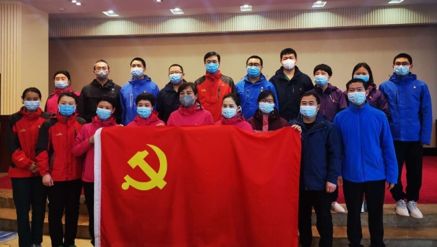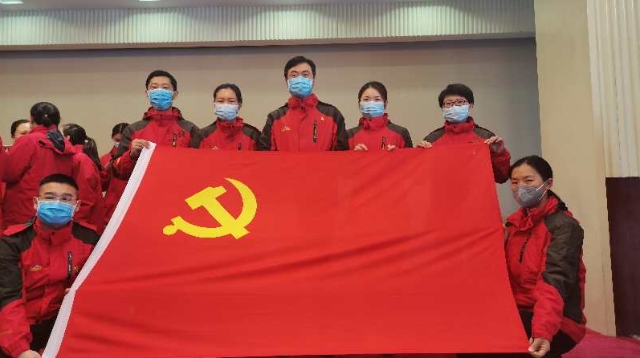 3月19日,周口援鄂醫(yī)療隊周口市中心醫(yī)院祁文麗、徐貴琴、解玉東、王亞麗、王玉才、王冰清6名隊員,站在鮮紅的黨旗面前莊嚴(yán)宣誓志愿加入中國共產(chǎn)黨。