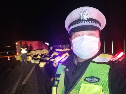 “事故發(fā)生在大廣高速北往南方向2092公里附近,是一起單方事故?!笔泄簿纸煌ü芾碇ш?duì)高速二大隊(duì)民警王航程說,到達(dá)現(xiàn)場后民警發(fā)現(xiàn),一輛輕型倉柵式貨車橫著側(cè)翻在路面,占據(jù)了兩個車道,應(yīng)急車道內(nèi)勉強(qiáng)能夠供過往車輛緩慢通行,一車娃娃菜灑滿了高速公路,在來車方向有幾十米遠(yuǎn)。此時天已經(jīng)黑了,雖然非常時期路上車輛不太多,但是還是不時有運(yùn)輸生活物資及救援物資車輛通過,一不小心隨時都有可能發(fā)生二次事故,現(xiàn)場需要馬上處置。