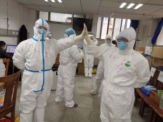 賀志勇說:“因為從2月14日起,港區(qū)醫(yī)院就開始對援鄂醫(yī)療隊員展開了培訓,經過這段時間的準備,醫(yī)療隊對三級防護的工作流程已經比較熟練,所以能夠很快進入工作角色?!庇捎谖錆h新冠肺長期以來缺乏醫(yī)護人員,訓練有素的港區(qū)醫(yī)療隊快速進駐,為病區(qū)帶來新的氣象,醫(yī)療隊員們根據國家衛(wèi)建委發(fā)布的新冠肺炎第七版診療方案,對患者們進行診治的同時,實時認真觀察他們病情變化,了解他們的需求,為患者排憂解難。賀志勇告訴記者,港區(qū)醫(yī)院醫(yī)療隊進入病區(qū)后,很快就取得了患者們的信任,患者們說,從來沒見過像河南隊一樣,業(yè)務能力好、對患者又這么親切的。