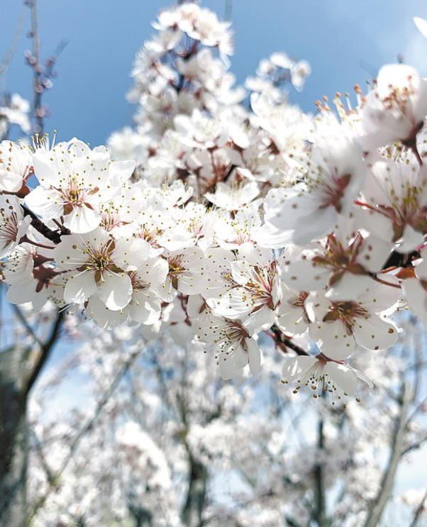“一葉春風(fēng)吹動(dòng)蕾,紅葉李花妍漫天?!奔t葉李又名紫葉李,屬薔薇科。走近觀看,細(xì)細(xì)密密的粉白色繁花開(kāi)滿枝頭,在紫色葉子的襯托下,顯得別致、靚麗。遠(yuǎn)遠(yuǎn)望去,像是爛漫層疊的櫻花,又宛如飄落大地的云霞,為春天平添幾分嫵媚、幾分浪漫。