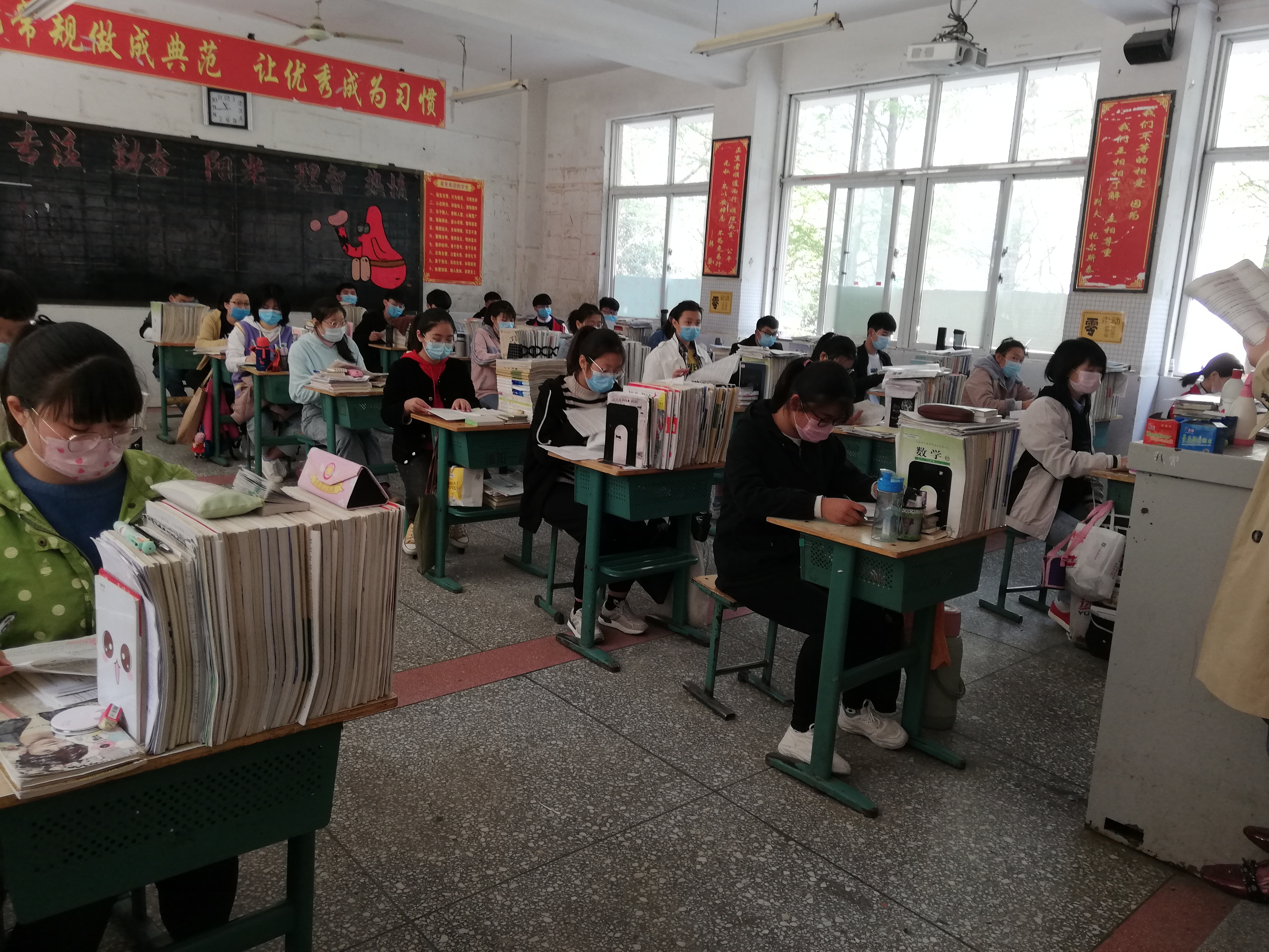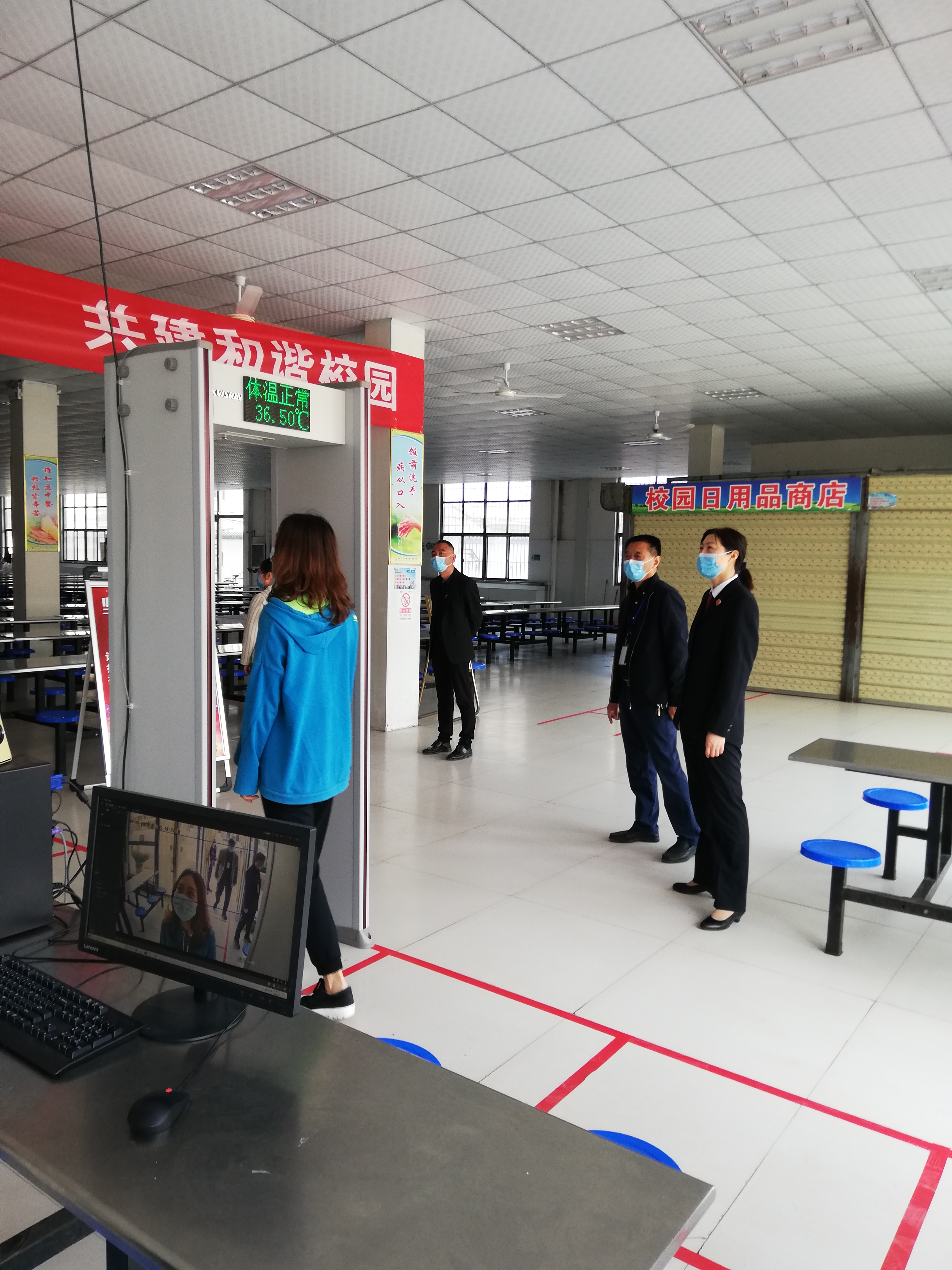 督導組一行嚴格按照河南省和周口市高三年級開學條件的具體標準對教室、餐廳、宿舍等人員易聚集場所進行了檢查,了解到各所學校都謹遵要求部署防控措施:學生教室由原來的大班分為30人為單位的小班,拉大課桌之間的距離;宿舍由8人間改為4人間的小寢室,管理人員定時消毒,學生需按地標線排隊出入宿舍;食堂分A、B組單人、單桌、單向錯峰就餐,餐具統(tǒng)一高溫消毒,留存每日食物樣本;每日體溫三測量,形成健康狀況表格層級上報……