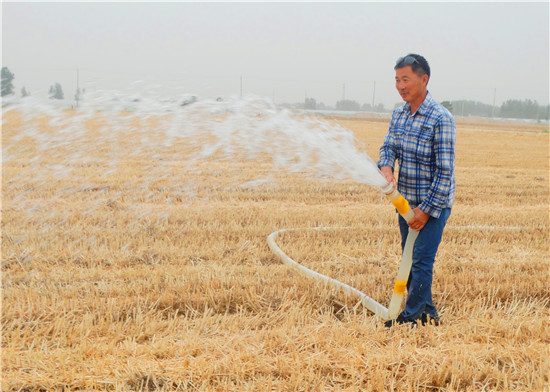 6月6日,沈丘縣周營(yíng)鎮(zhèn)農(nóng)民正忙著抗旱“造墑”、“補(bǔ)墑”澆水,期待奪取秋糧豐收。 近期來(lái),由于連續(xù)多日高溫?zé)o雨,土壤墑情差,無(wú)法播種秋作物。針對(duì)當(dāng)下嚴(yán)重的旱情,沈丘縣掀起“雙抗旱”(抗旱保苗、抗旱種秋)高潮。目前,該縣日出動(dòng)勞力1.8萬(wàn)余人,出動(dòng)各類噴灌機(jī)械26000多臺(tái)(套),力保農(nóng)田播種的玉米出苗。