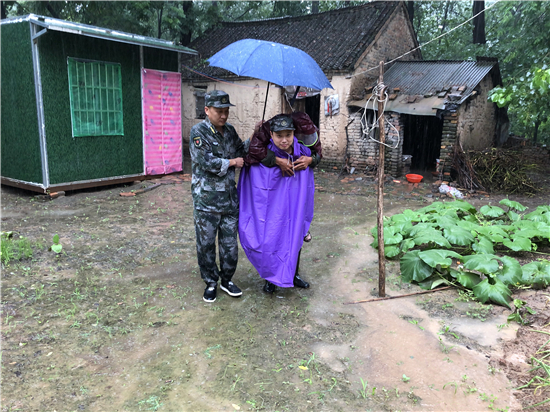 強降雨導致部分地勢較低的農(nóng)房及農(nóng)田被淹,在排查中,發(fā)現(xiàn)鄭老莊村幾處農(nóng)房被水淹泡,隨時有倒塌的危險,了解這一情況后,該鎮(zhèn)第八工作區(qū)區(qū)長、“中國好人”、優(yōu)秀退役軍人蔣昆立即組織鄭老莊村兩委人員及民兵應急隊,第一時間趕到現(xiàn)場,轉(zhuǎn)移隱患點周圍住戶?!坝暝絹碓酱?,你們這個屋今晚上不能住了,反正隨時都有倒塌的危險,把要緊的東西收拾一下,跟到我們走快點”蔣昆勸說鄭老莊村受災的一名老大爺。