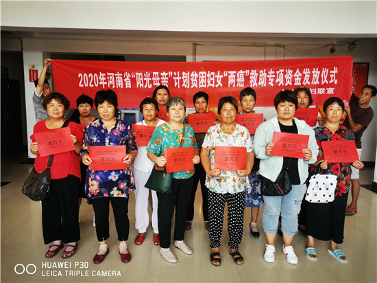 據(jù)悉,此次發(fā)放的公益金來自于河南省陽光母親貧困婦女兩癌救助金。其救助對(duì)象是經(jīng)過有檢查資質(zhì)的醫(yī)療機(jī)構(gòu)確診、患有宮頸癌ⅡB以上或浸潤型乳腺癌的農(nóng)村貧困婦女,救助標(biāo)準(zhǔn)為每人一次性救助1萬元。