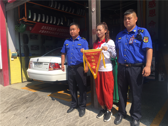 夏日的陽(yáng)光透過(guò)清澈的天空照下來(lái),街很凈,樹(shù)很綠。8月18日是開(kāi)發(fā)區(qū)城管稽查大隊(duì)進(jìn)行“門(mén)前三包”流動(dòng)紅旗和流動(dòng)黑旗評(píng)選的日子。開(kāi)發(fā)區(qū)城管稽查大隊(duì)工作人員根據(jù)綜合評(píng)比標(biāo)準(zhǔn),分別為“門(mén)前三包”工作突出的門(mén)店懸掛流動(dòng)紅旗,為“門(mén)前三包”工作不力的門(mén)店懸掛黑旗。